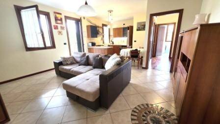 PORTEGRANDI. In piccolo contesto condominiale di sole 05 unità, posizione tranquilla e a pochi minuti di macchina dal campus H Farm, libero appartamento al primo ed ultimo piano, composto da ampio soggiorno-cottura di mq. 31 ca. con porta finestra per accesso alla terrazza coperta che ospita la caldaia murale esterna, disimpegno zona notte, due camere da letto (mq. 16,65 e mq. 10,50 ca.) e bagno spazioso con doccia e attacco lavatrice. Completano la proprietà un garage con magazzino con predisposizione per piccola lavanderia al piano terra ed un posto auto, ad uso esclusivo, all'interno dello spazio condominiale. L'abitazione è ben tenuta: troviamo pavimenti in ceramica nella zona giorno e in bagno, mentre nella zona notte troviamo legno; oscuri esterni in legno, infissi interno in legno + vetrocamera, zanzariere ovunque. Riscaldamento a pavimento e impianto aria condizionata appena sostituita nel 2024.