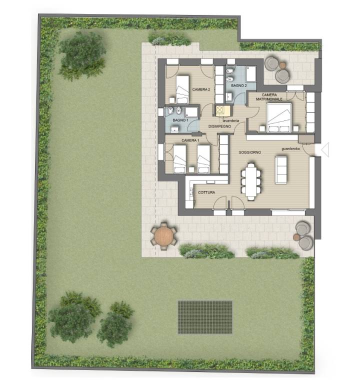 La zona notte include tre camere da letto e due bagni finestrati, garantendo privacy e comfort a tutta la famiglia.