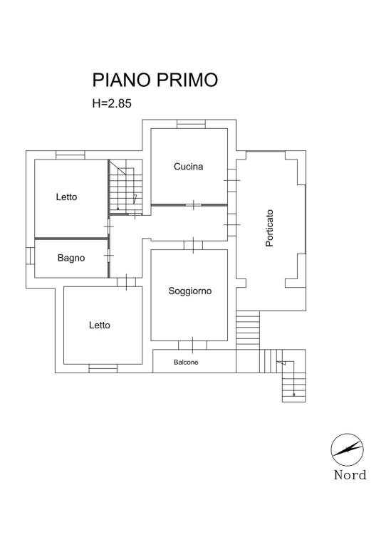 Il primo piano, con caratteristiche tipo di appartamento per civile abitazione su unico livello, presenta 4 camere + accessori (cucina abitabile, soggiorno o studio o camera l., c. letto matrimoniale, seconda c. letto, 1 bagno) ed è accessibile sia tramite scala esterna, con passaggio attraverso ampio terrazzo coperto al p.p. (utilizzabile come espansione della cucina), sia tramite scala interna in cemento armato, di collegamento diretto con i locali al piano terra. Il piano primo è stato recentemente tinteggiato ed è pronto e fruibile come abitazione, dotato di impianti (elettrico, idrico-sanitario, gpl, riscaldamento con termosifoni e caldaia) e caminetto a legna all’interno della cucina abitabile. Sono presenti infissi in legno ed avvolgibili dell’epoca di costruzione.