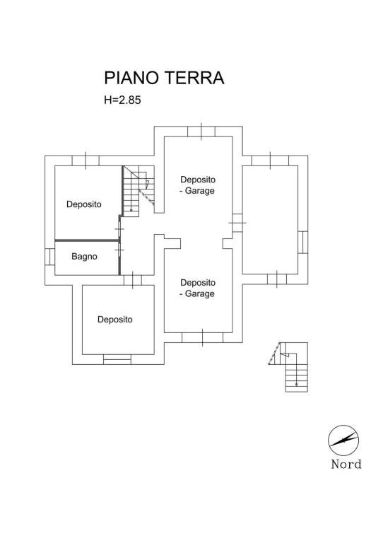 Il piano terra, concepito come garage/deposito, è composto da 5 locali, di cui 2 con accesso carrabile, più 1 bagno (completo di sanitari). Il p.t. è interamente pavimentato, chiuso solo con serramenti esterni, dotato di impianti elettrico, idrico-sanitario ed altre predisposizioni impiantistiche per la massima versatilità.