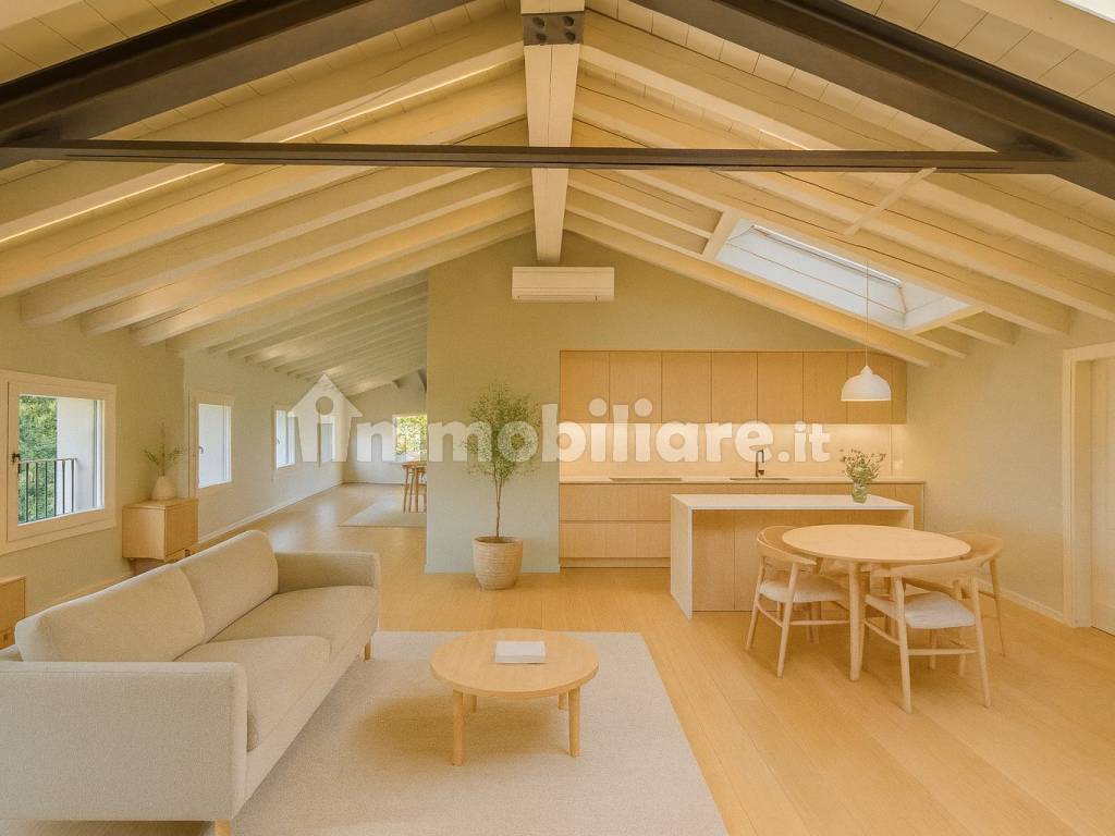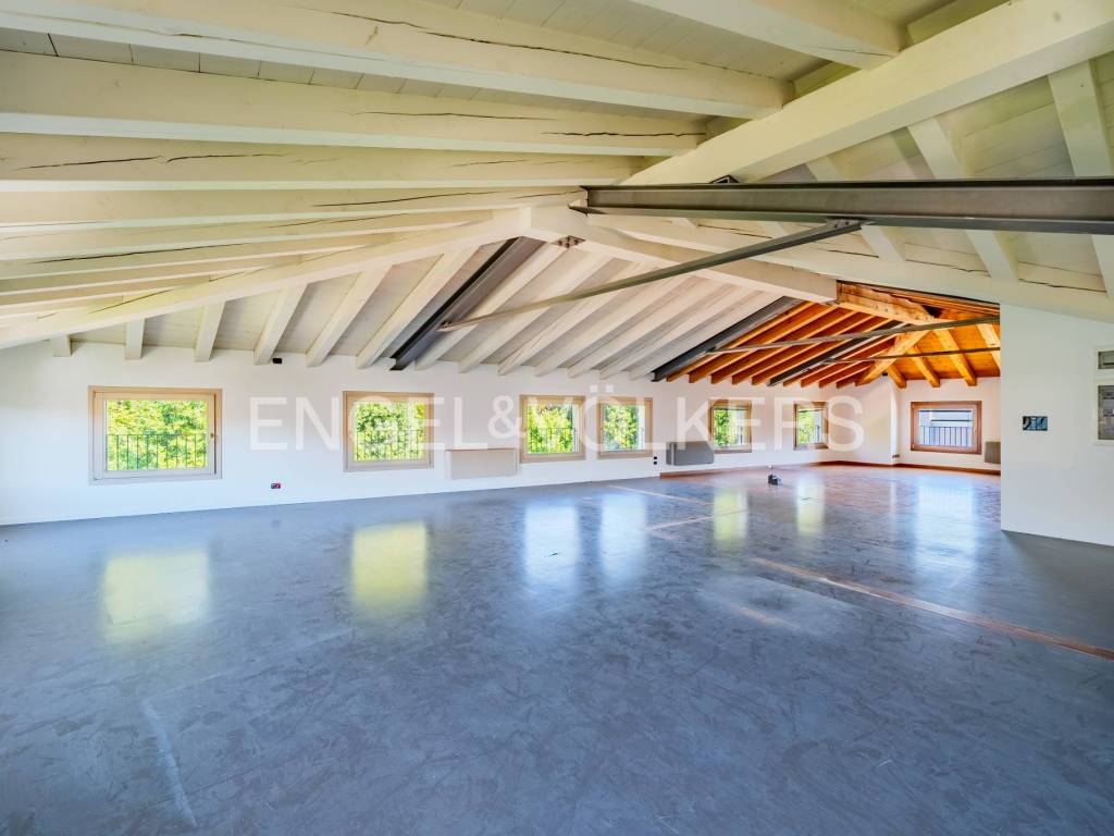 Attualmente concepito come open space, l’immobile è impreziosito da una splendida traviatura a vista e da grandi superfici finestrate che lasciano entrare la luce naturale in ogni momento del giorno. Lo sguardo si apre sul verde circostante, trasformando ogni finestra in un quadro vivente che cambia con le stagioni.