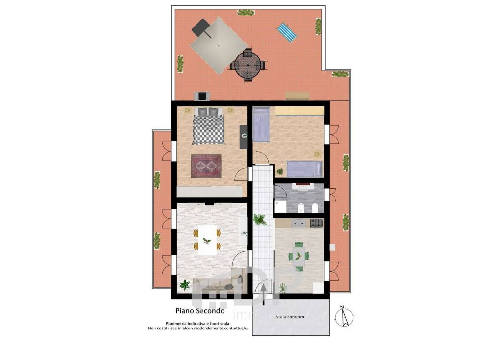 Tutte le stanze affacciano sui due balconi, uno esposto a est e l'altro a ovest: da quest'ultimo si accede a un terrazzo di circa 47 mq, recentemente ristrutturato, perfetto per momenti all'aperto e da godersi anche nei mesi invernali con l'istallazione di una serra bioclimatica o una pergotenda. Il panorama che si apre verso il Monte Gennaro regala una bellissima vista.