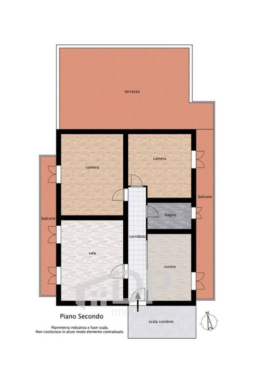 La zona notte, separata da un disimpegno, comprende due camere da letto — una delle quali di circa 20 mq — e un bagno con doccia.