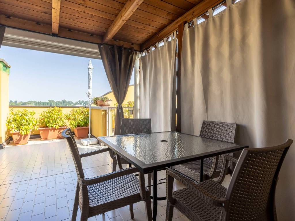 Splendida localizzazione ai piedi delle colline, in posizione centralissima, al contempo comoda ad ogni servizio (centro commerciale, scuole, sport e benessere, pista ciclopedonale, autobus) ed in un contesto verde e silenzioso, con pochi eguali. Particolarissimo appartamento all'ultimo piano su due livelli, estremamente luminoso, con triplo affaccio e sostanzialmente privo di alloggi confinanti. Sala con cucina "in affaccio" e loggia panoramica mq 10, due camere da letto, di cui la padronale con ulteriore loggia e due bagni. Al piano sovrastante - con accesso dalla sala - grande vano mansardato con meraviglioso terrazzo di mq 21 in proprietà esclusiva e parzialmente coperto. Da vedere! Riscaldamento autonomo e aria condizionata. Autorimessa di mq 19 compresa nel prezzo. Euro 375'000.00. Rif. COM043
