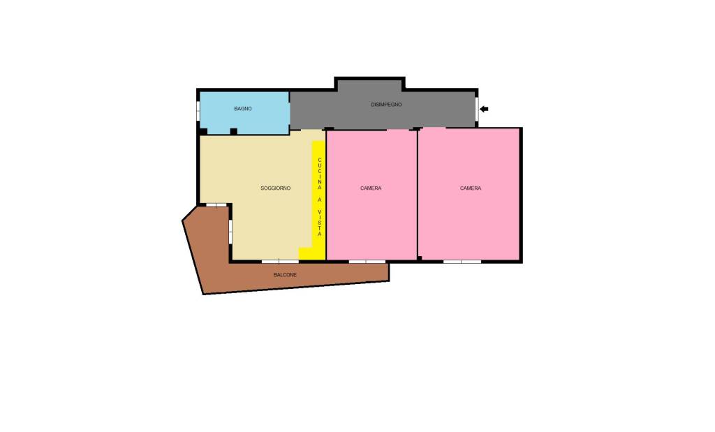 L’appartamento è composto da un disimpegno d’ingresso che conduce alla zona giorno costituita dal soggiorno con cucina a vista e accesso diretto al balcone. Nella zona notte troviamo il bagno con box doccia e due ampie camere da letto.