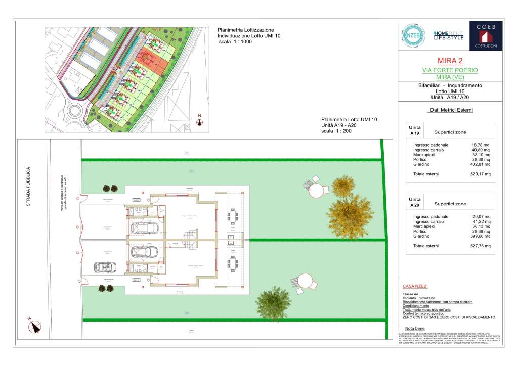 La bifamiliare disporrà di circa 500m² di giardino e di uno spazioso portico da 27m². Al piano terra troveremo un'ampia zona soggiorno-cucina di 50m² caratterizzata da grandi finestre scorrevoli, garage singolo, bagno con antibagno e disimpegno. Salendo al secondo piano troveremo 4 camere, 2 bagni, 1 disimpegno che collega il tutto ed 1 terrazzo da 7m². Il complesso abitativo sorgerà in una lottizzazione chiusa e vicina al centro città, che offre tutti i principali servizi: scuole(asilo a 3.1km, elementari a 1.3 km, medie a 3.7 km)-banca a 3 km-supermercato a 1.8 km-poste a 3.5 km-fermata dell'autobus a 1.1 km-fermata del treno a 2.4 km-farmacia a 2.4 km. Risulterà comodo anche a centri di interesse quali l'isola di Venezia(22 km), Mestre(12.3 km) e Marghera(9 km). Gli edifici saranno costruiti in classe energetica A4, con moderne tecniche realizzative ed impianti di ultima generazione abbinati a domotica, così da offrire elevata qualità di vita e costi di gestione ridotti.