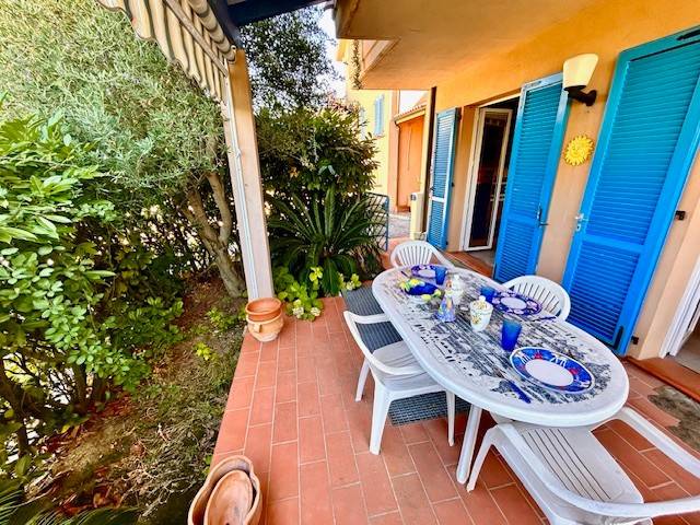 Ingresso indipendente sulla corte pavimentata, ambiente ideale grazie anche al patio per pranzi e cene all'aperto. Dalla corte si entra nella casa direttamente nell'ampia zona giorno con angolo cottura e penisola. Zona notte composta da camera matrimoniale, bagno finestrato e seconda camera con accesso diretto al giardino sul retro. Aria condizionata e riscaldamento autonomo. La casa si presenta in buone condizioni e viene venduta già arredata. Completa la proprietà un posto auto esclusivo e privato all'interno del residence.
