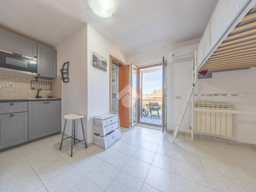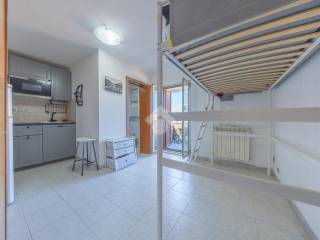 L'appartamento, è stato organizzato in modo pratico e funzionale: l'ingresso accoglie in una zona adibia con letto a castello che permette di mantenere spazio utile per un'eventuale scrivania o tavolo; proseguendo troviamo una zona adibita ad angolo cottura ben disposto e un locale adibito a bagno con finestra.