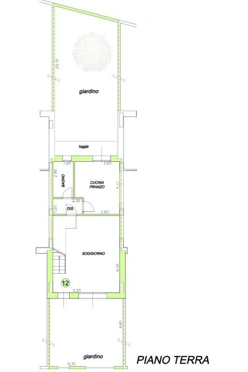 Piano terra composto da soggiorno luminoso con affaccio sul giardino di proprietà , bagno e cucina separata con affaccio sul secondo giardino.