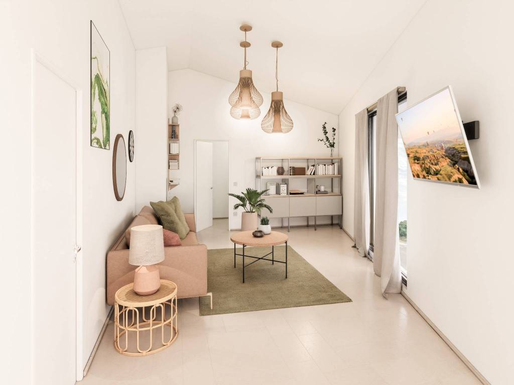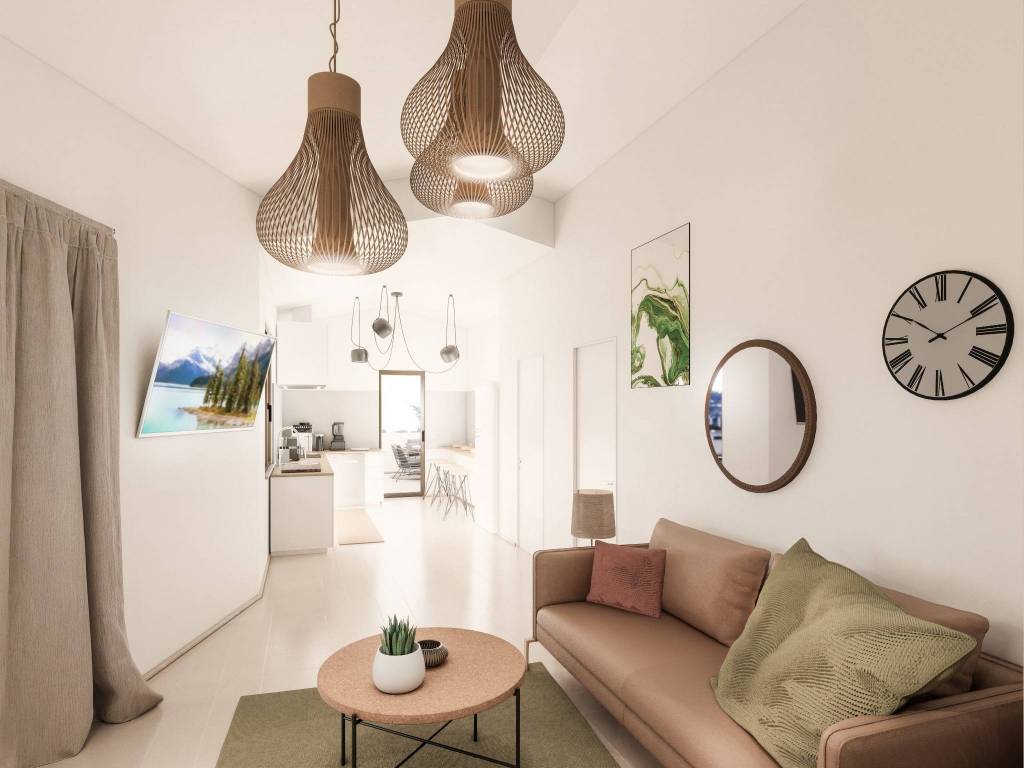 Soggiorno di 36 mq con angolo cottura e accesso diretto alla terrazza di 16 mq con tre lati aperti, uno spazio perfetto per vivere momenti all’aperto.
