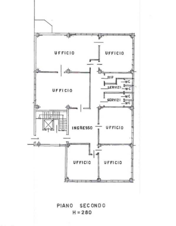 • piano secondo ingresso, sei locali ufficio, due locali servizi con due wc ed un ripostiglio di mq 373,50.