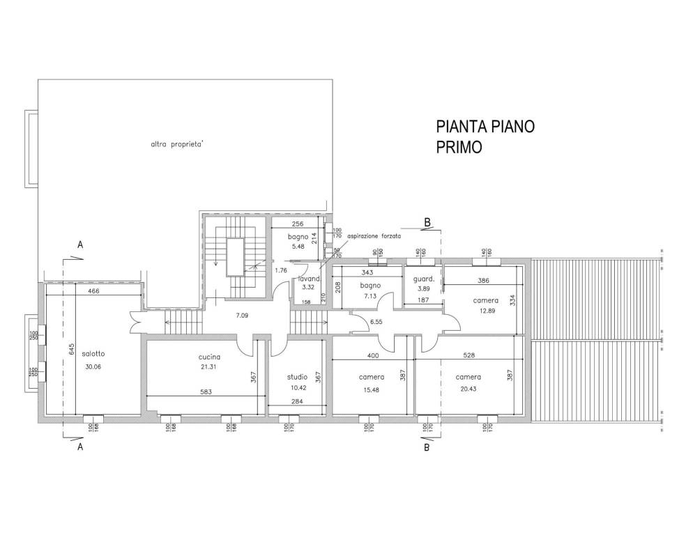 Gli spazi interni del PRIMO PIANO, di 200 mq commerciali, sono stati ideati per creare movimento all'appartamento avendo delle piccole scalinate all'interno che portano in zona giorno con salotto di 30 mq., grande cucina di oltre 21 mq., e in zona notte con 3 camere da letto dalle ampie metrature di oltre 20 mq, 15 mq, e quasi 13 mq. Oltre ad un comodissimo studio separato di 10 mq, e a 2 bagni finestrati con lavanderia.