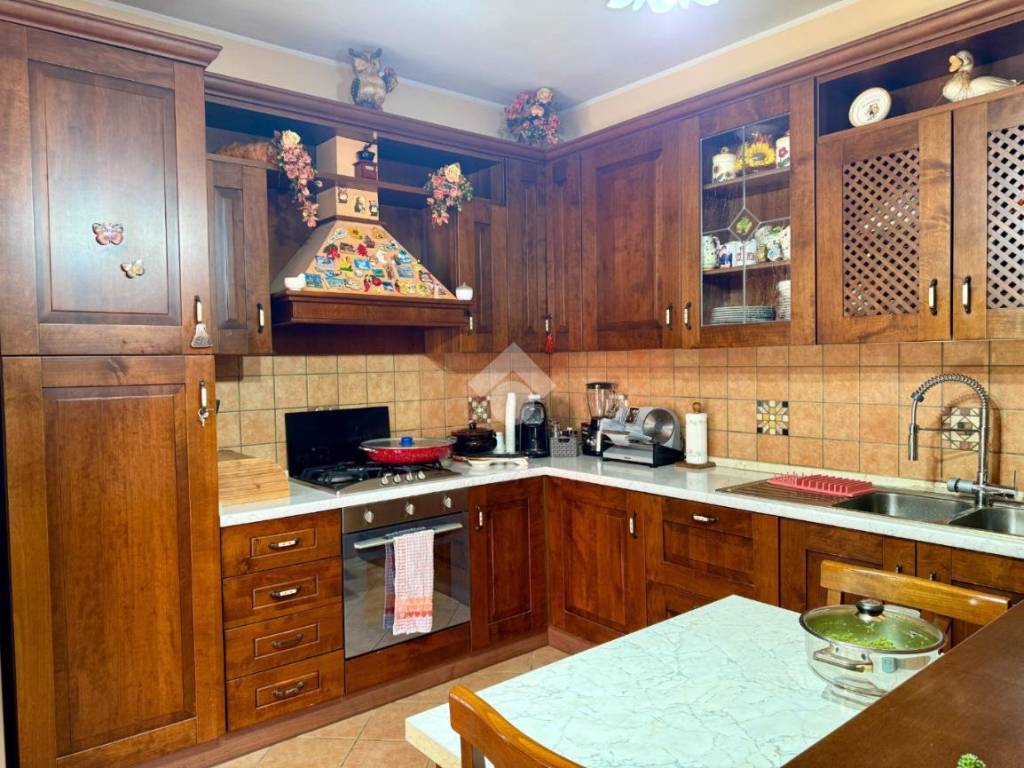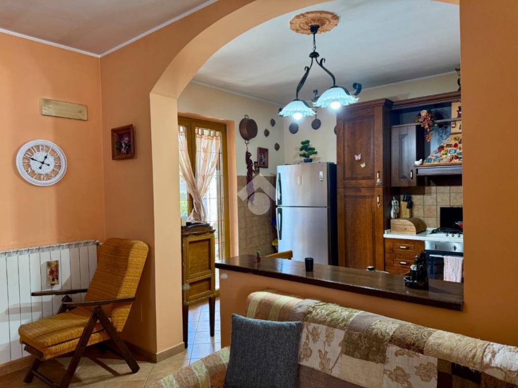Entrando, la zona giorno colpisce subito per la luce: una grande vetrata panoramica illumina l’ambiente e mette in comunicazione interno ed esterno, creando una sensazione di continuità e benessere. Il salone ampio e accogliente si fonde con la cucina a vista, separata da un raffinato arco che dona carattere e movimento agli spazi, mantenendo una divisione armoniosa tra i due ambienti.