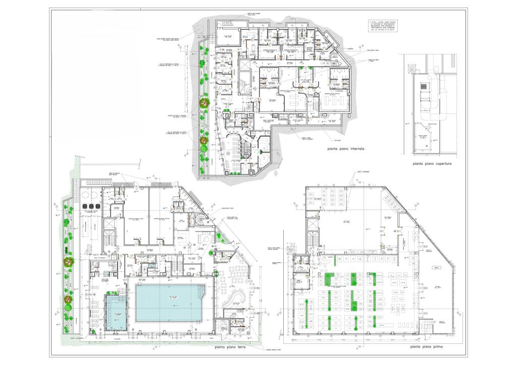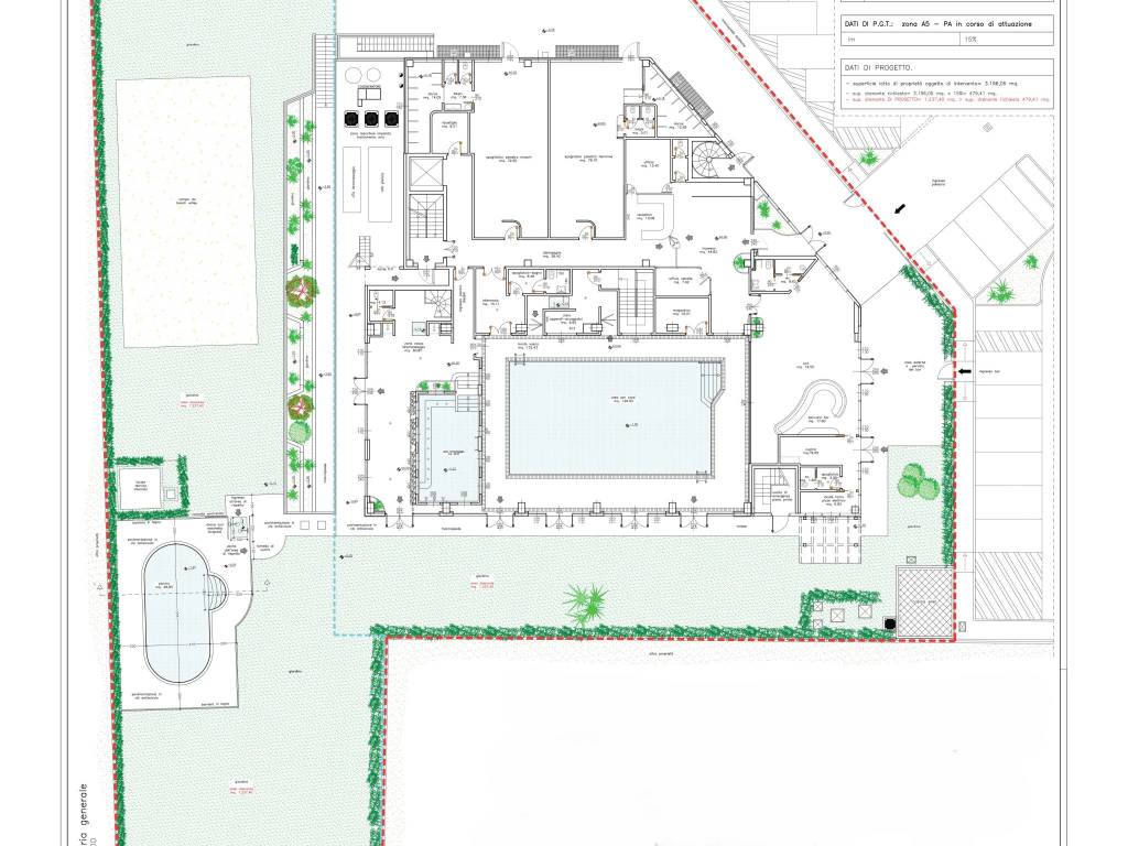 La struttura si sviluppa su circa 2600 mq coperti distribuiti su 3 piani, oltre ad un giardino di pertinenza, dove è collocata la piscina esterna.