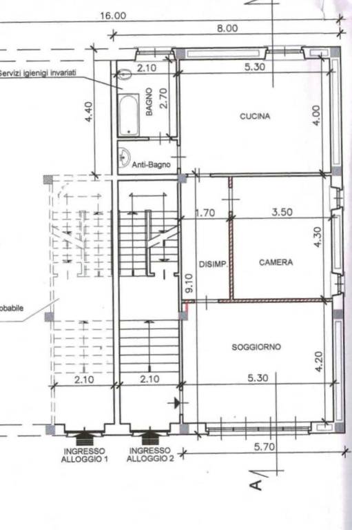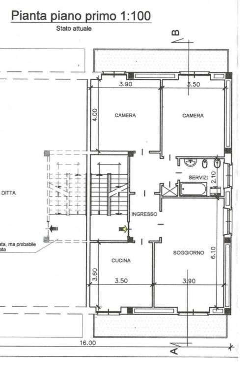 Piano primo: ingresso su disimpegno, salone con parete cottura di 35 mq. ca con accesso su balcone fronte strada, due camere, entrambe con accesso su balcone interno, servizi e ripostiglio.