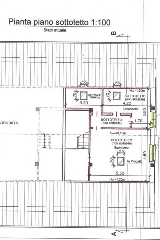 Piano secondo (mansardato): sottotetto non abitabile di 50 mq. ca con ottime caratteristiche, centrale termica e servizi ad uso lavanderia.