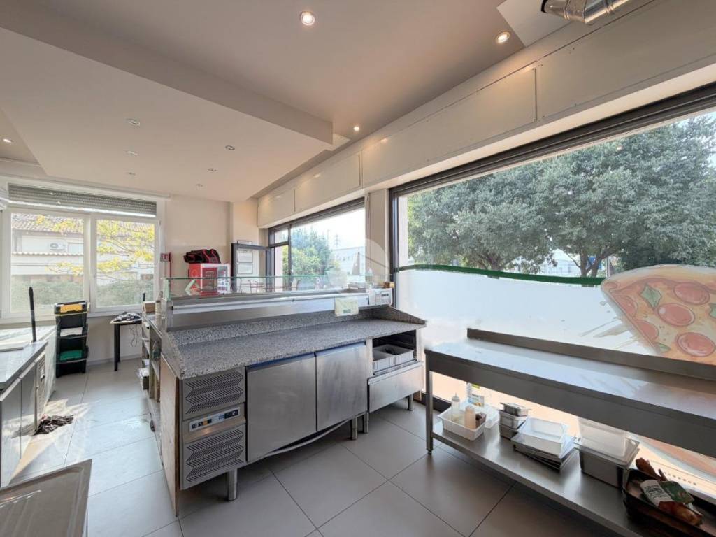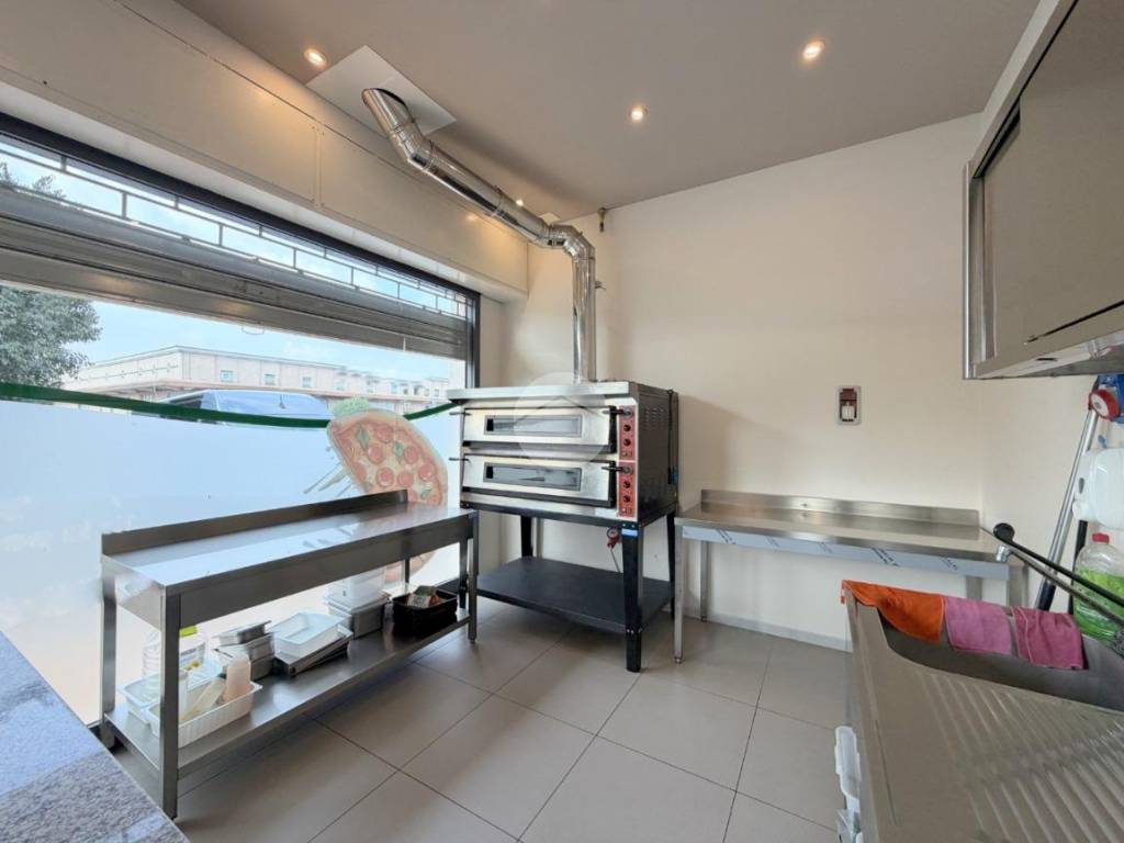 Accedendo al locale troviamo una zona rivendita dove è presente un bancone ed un forno pizza con canna fumaria.