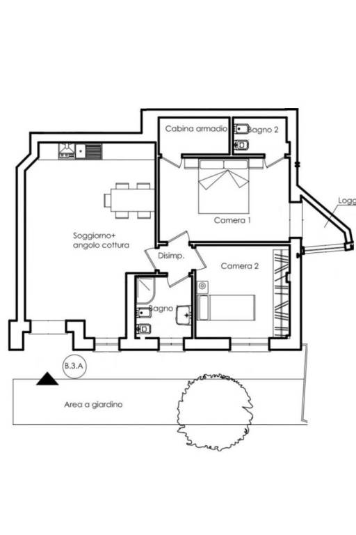Trilocale con ingresso indipendente composto da soggiorno-angolo cottura, due camere, due bagni e giardino privato.