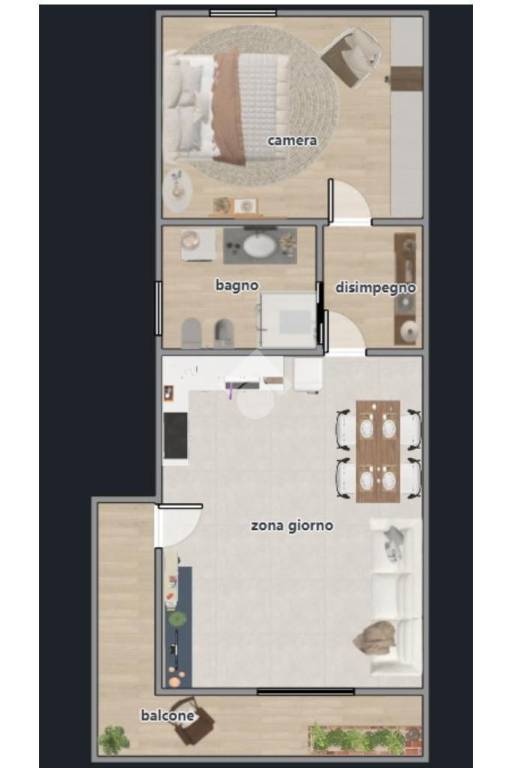 L’abitazione si compone di un luminoso soggiorno con angolo cottura, valorizzato da un’ampia porta finestra che garantisce grande luminosità e consente l’accesso al balcone, ideale per momenti di relax all’aperto.
