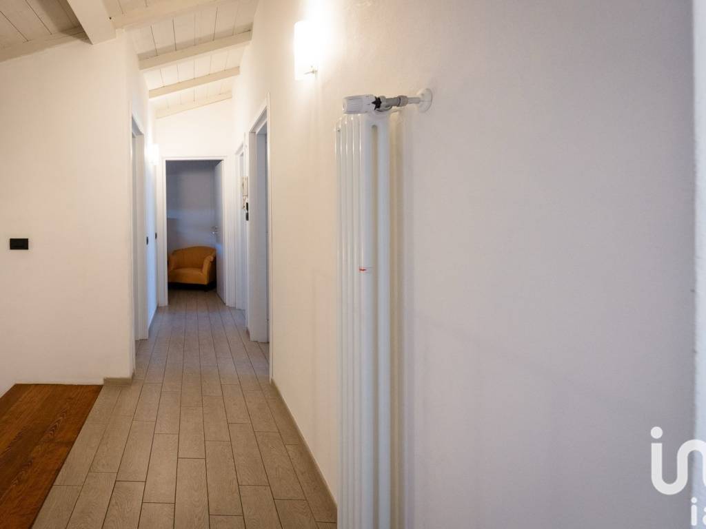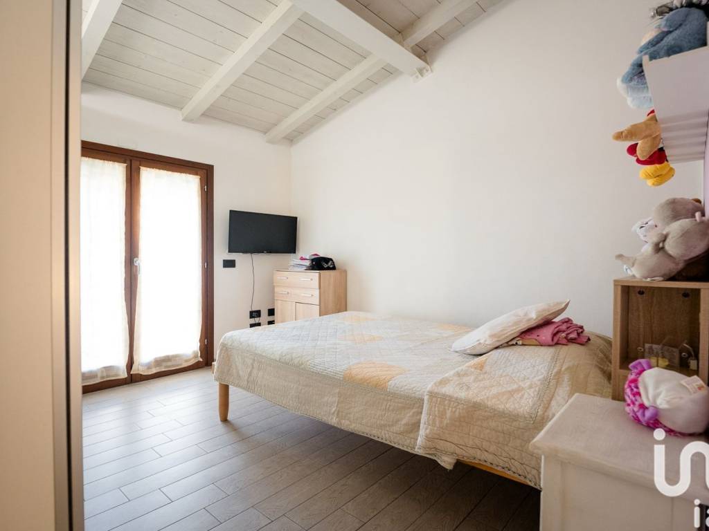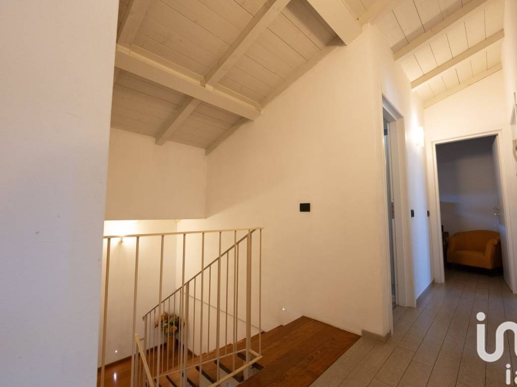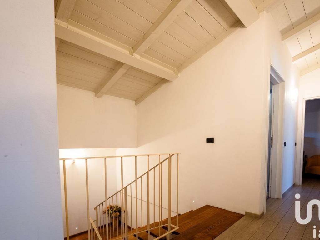 Salendo al piano superiore, lo sguardo viene catturato dal suggestivo tetto con travi a vista bianche, che dona luminosità e un tocco di eleganza all'ambiente.