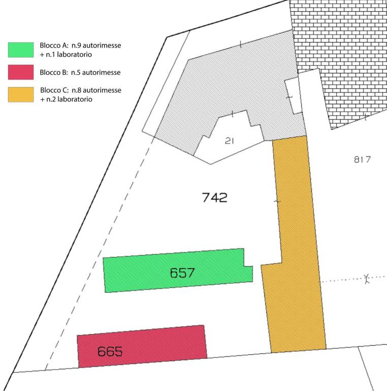 In via Alba n. 23, a 600m dal centro di Canelli, n. 3 edifici composti in totale da n. 19 autorimesse singole e n. 3 laboratori artigianali.