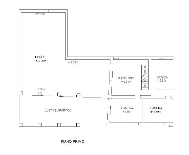 Primo piano con tre camere da letto, disimpegno e un grande fienile con altezze variabili (da 2,80 a 3,10 m), perfetto per creare ulteriori ambienti abitativi o uno spazio studio/laboratorio.
