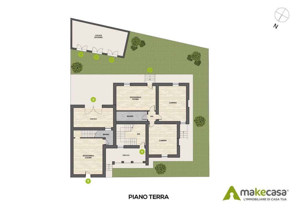 In alternativa, grazie all'ampia metratura e alla disposizione degli ambienti, è possibile unire gli spazi e realizzare una grande villa unifamiliare con zona giorno al piano terra, camere al piano superiore, locali accessori e cantine al seminterrato, oltre a un locale esterno ideale come laboratorio o dependance.