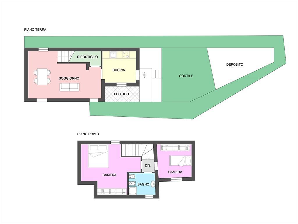 Entrando in casa siamo accolti dal soggiorno con cucina abitabile e ripostiglio, salendo le scale arriviamo alla zona notte composta da due camere da letto e dal bagno con doccia.