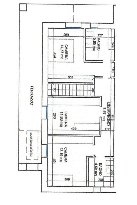 Al primo piano troviamo il disimpegno, due camere singole di generose metrature, il bagno, la camera matrimoniale con il bagno dedicato