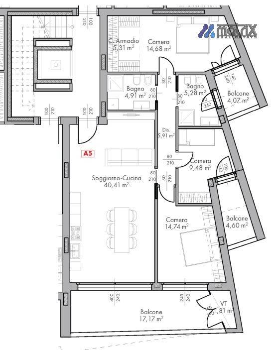 - ingresso soggiorno/angolo cottura di 42,00 mq, porte scorrevoli che portano ad un terrazzo di 20 mq