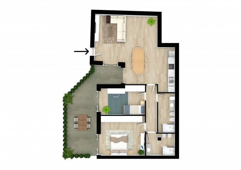 Residenza 11 – TRILOCALE CON GIARDINO, SOGGIORNO,ZONA PRANZO CON CUCINA A VISTA, DUE CAMERE E CON DOPPI SERVIZI