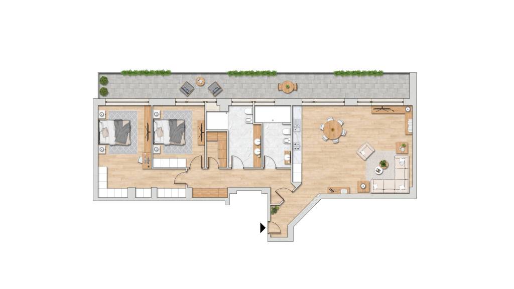 La zona notte comprenderà due camere da letto, di cui una con cabina armadio, e due bagni.