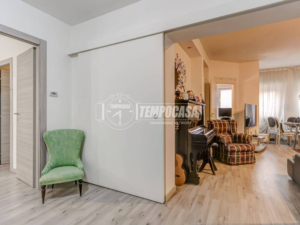 L’ingresso si apre su un luminoso soggiorno, ambiente accogliente e ben vivibile.