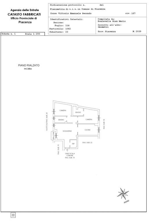 La distribuzione interna prevede un grande soggiorno, cucina abitabile separata dal soggiorno con due porte scorrevoli, disimpegno, camera doppia, camera matrimoniale con bagno privato con doccia, secondo bagno con vasca e ripostiglio. Dal soggiorno si accede al balcone, lato cortile interno, offrendo tranquillità e luminosità. Dall’altro lato, cucina e camera matrimoniale affacciano sulla piazzetta interna, riservata e silenziosa. Le due camere, posizionate all’estremità dell’edificio, non confinano con altri appartamenti, garantendo privacy e massima quiete.