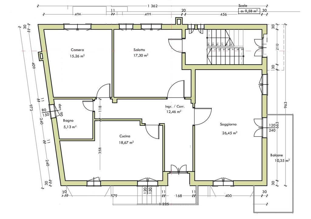 - Unità al PRIMO PIANO di circa 130 mq lordo muri composta da ingresso indipendente, salone 26,5 mq, cucina con zona pranzo 18,7 mq, 2 camere matrimoniali (17., + 15,26 mq), un bagno finestrato, un terrazzo con, al piano terreno, un garage di 20 mq. Cl. F EP 227,31 Kwh mq.