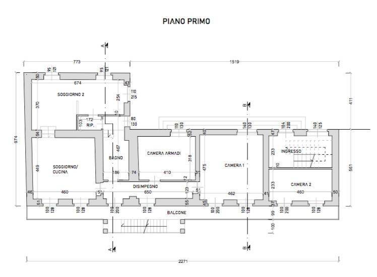 Proseguendo tramite una scala esterna accediamo al piano primo, composto da cucina abitabile, un bagno e tre camere da letto, di cui una potrà essere, se necessario, trasformata in salone.