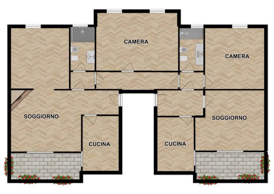L’appartamento, situato al piano terra, si distingue per una caratteristica rara: sviluppo su tutti e quattro i lati del fabbricato, che garantisce luce naturale costante, privacy e una percezione di indipendenza difficilmente replicabile. La presenza di un doppio ingresso consente inoltre una grande flessibilità d’uso, con la possibilità di suddivisione in due unità abitative.