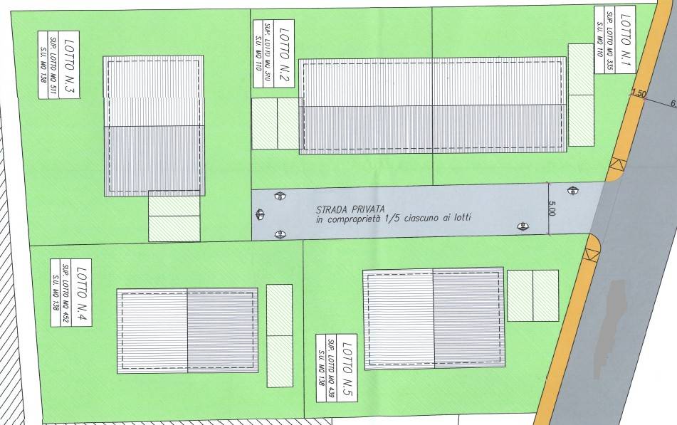 Trattasi di un'area divisa in n. 5 lotti, dove da primo progetto è possibile creare tre abitazioni singole ed una bifamiliare. Lotti n. 1: Sup. Lotto mq 335 - S.U. mq 110 Bifamiliare Lotti n. 2: Sup. Lotto mq 310 - S.U. mq 110 Bifamiliare Lotti n. 3: Sup. Lotto mq 439 - S.U. mq 138 Singola Lotti n. 4: Sup. Lotto mq 452 - S.U. mq 138 Singola Lotti n. 5: Sup. Lotto mq 511 - S.U. mq 138 Singola