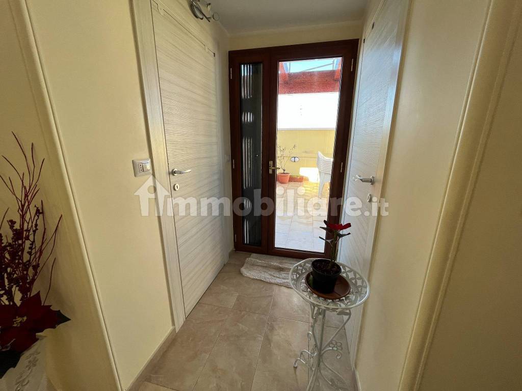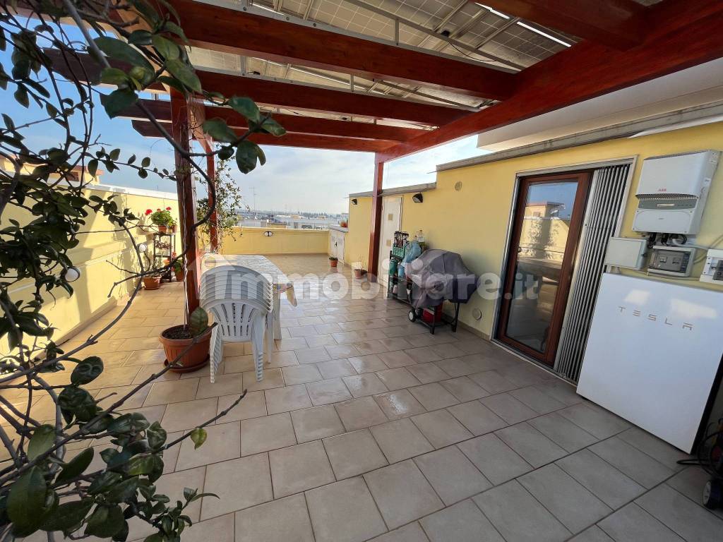 In zona centrale e servita, proponiamo in vendita attico di 3 vani 100 mq circa, composto da ingresso, soggiorno pranzo con angolo cucina, disimpegno con due ampie camere da letto con balcone e bagno padronale. Stanza lavanderia e deposito, ampio terrazzo a livello con pergolato in legno con impianto fotovoltaico. L'immobile è stato recentemente ristrutturato e dispone delle seguenti rifiniture: Infissi taglio termico, tapparelle in alluminio elettriche, riscaldamento autonomo con caldaia e gestione mista a pompa di calore a risparmio energetico, impianto fotovoltaico da 4,8 kw. ecc. Classe C