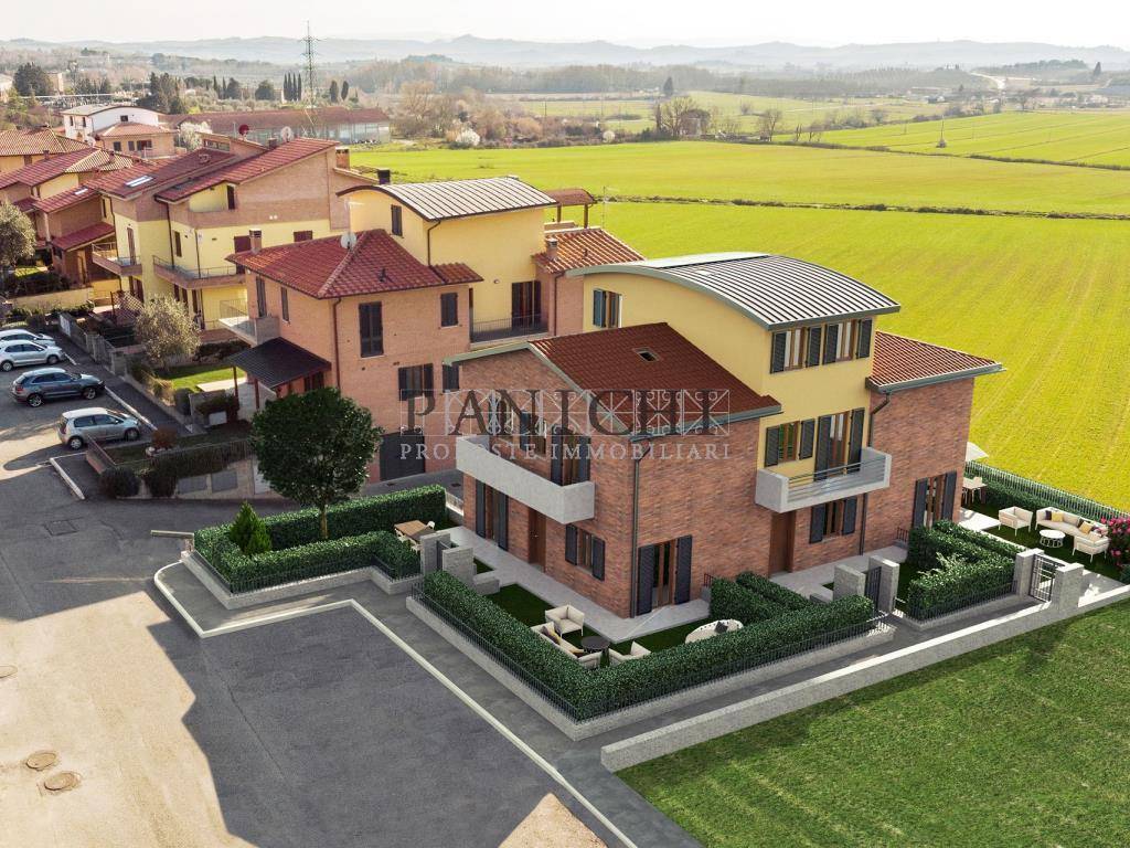 In zona residenziale di Serre, frazione di Rapolano Terme, vicino ai servizi prinicipali, ai collegamenti stradali e allo stesso tempo ai margini della campagna circostante, si propone una bellissima soluzione di villetta terratetto, porzione di testata, in fabbricato trifamiliare di nuova costruzione, disposta su 2 livelli oltre al garage con ampio resede privato e terrazzo.
