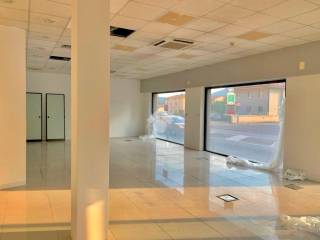 La soluzione vanta la presenza di quattro vetrine in posizione angolare, tre affacciano sulla strada principale mentre una con l'ingresso pedonale su un piccolo parcheggio nel quale vi sono due posti auto di pertinenza.
