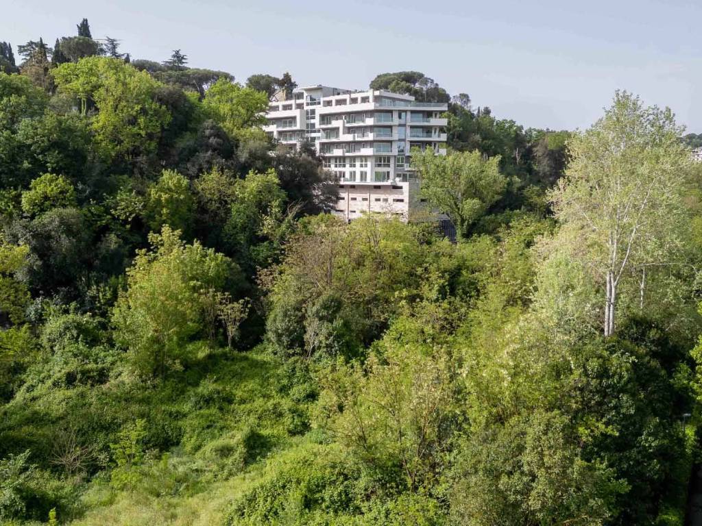 L’edificio è all’interno di un comprensorio di due sole palazzine che ha accesso da una strada privata e da un percorso pedonale . Tale comprensorio è immerso nel verde , in quanto ubicato sulla collina sovrastante il Parco dell’Acqua Traversa a circa 80 metri di altezza da cui si vede la quasi totalità del Parco.