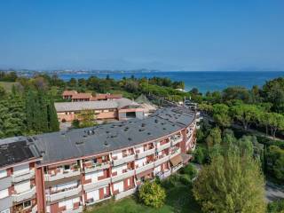 Inserito in esclusivo contesto provvisto di grande parco secolare, spiaggia privata, piscina, campi da tennis, portineria ed ascensore, appartamente completamente ristrutturato posto all' ultimo piano. Il residence si trova in posizione esclusiva, proprio di fronte al lago e comodo al centro del paese. L'unità immobiliare in oggetto è stata recentemente ristrutturata e si presenta in ottime condizioni manutentive. L'ingresso apre direttamente sulla zona living affacciata sul grande terrazzo con vista sul parco; il cucinotto è separato e dotato di finestra. La zona notte ospita le due camere da letto e il bagno. Le camere dispongono di secondo balcone dal quele si può godere di buona vista sul lago. Cantina e garage di proprietà nel locale interrato.