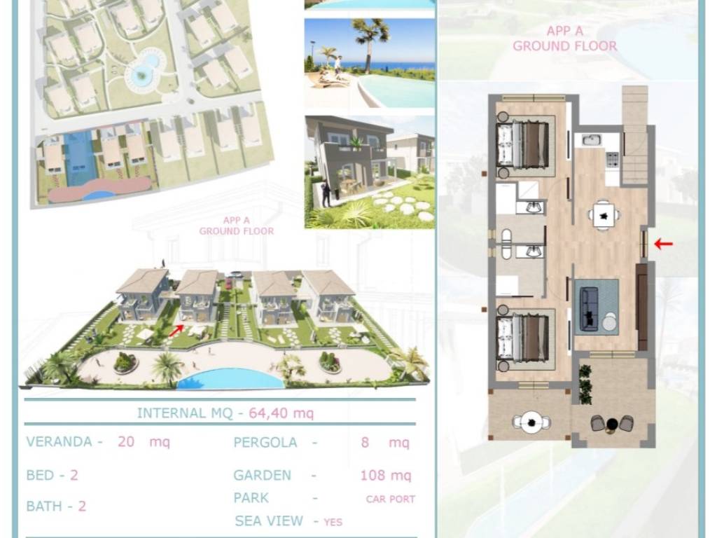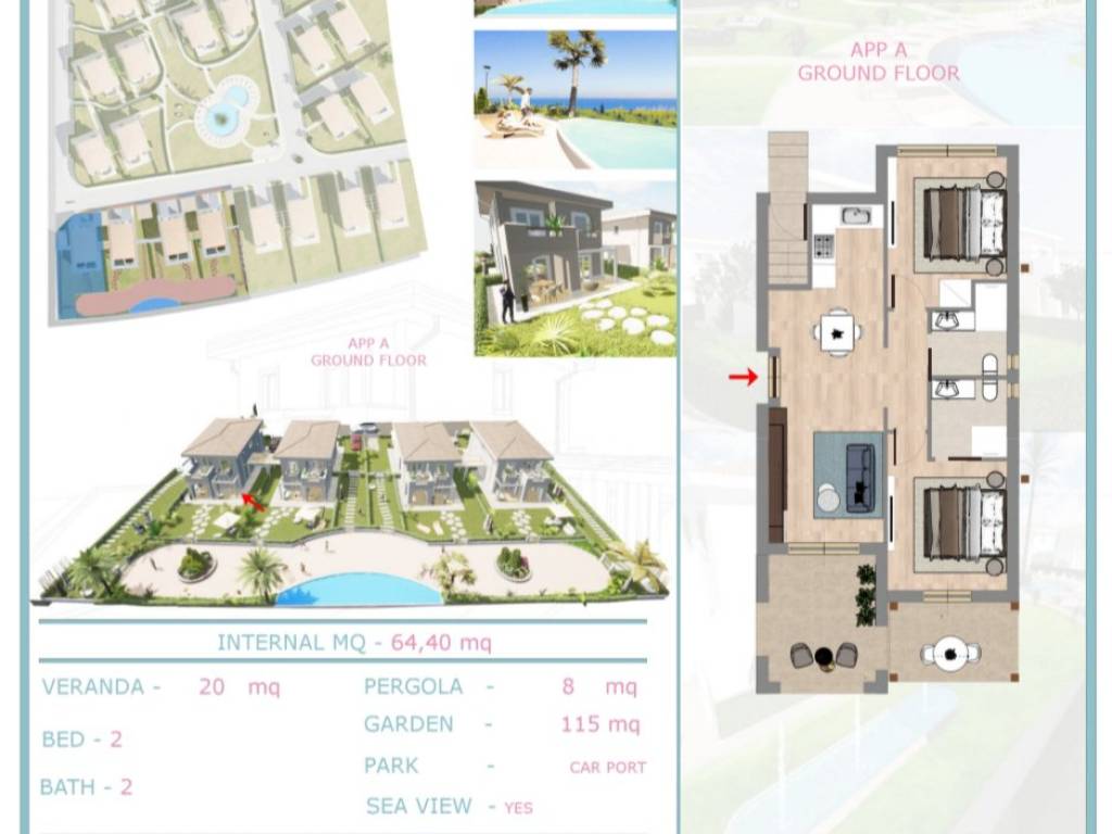 Ulteriori vantaggi includono un parcheggio dedicato, una piscina comunitaria e ampi spazi esterni per il relax.