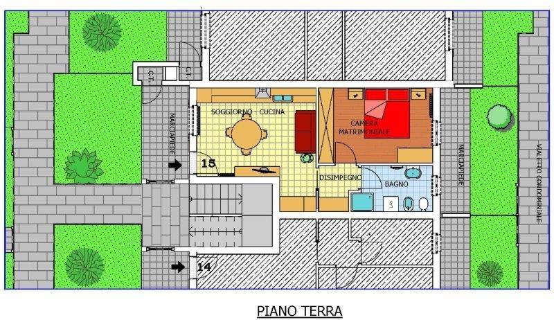 Pedecollinare nuovo 2 locali con ingresso indipendente, soggiorno con zona cucina con accesso al porticato e al giardino privato, camera da letto matrimoniale, ripostiglio e bagno.