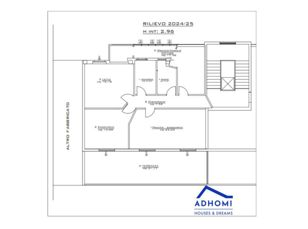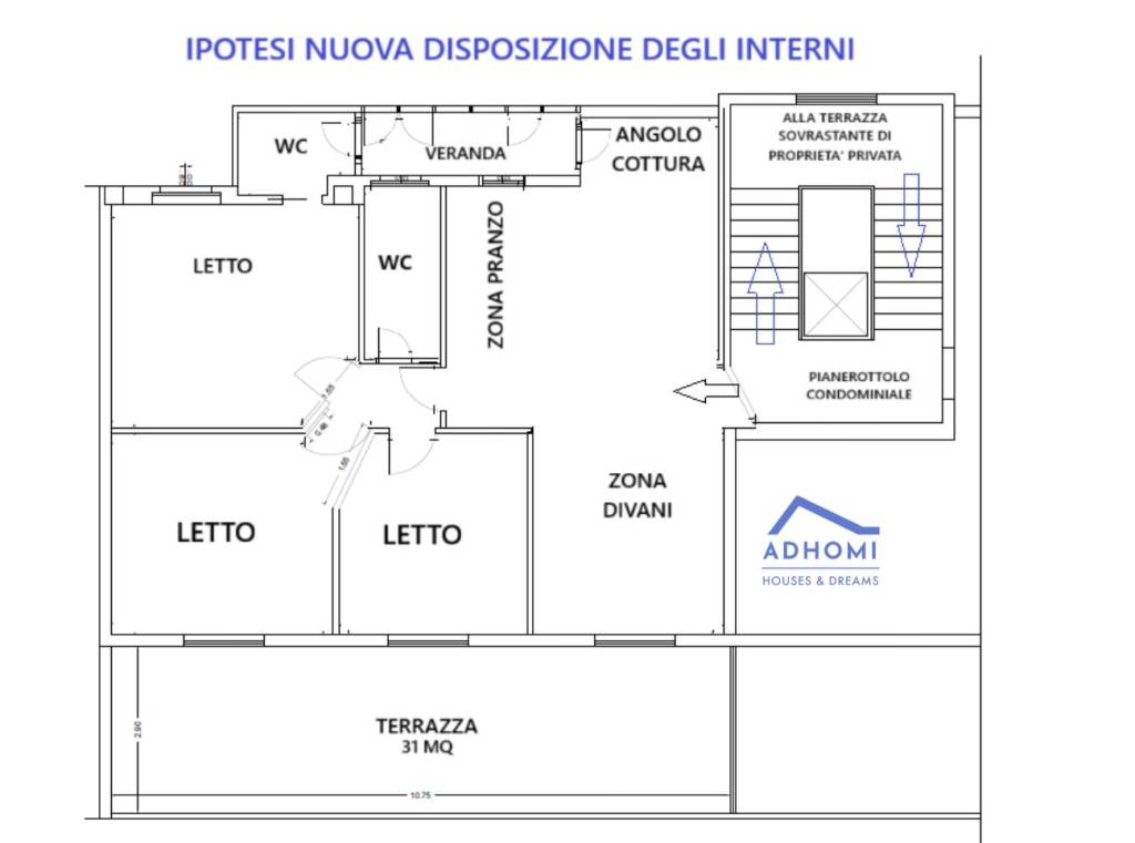 Proponiamo anche una planimetria con una ipotesi di riorganizzazione degli spazi interni che consentirebbe di ottenere un quadrivano con due bagni in zona notte e ampia zona giorno con doppio affaccio. Possibilità di collegare dall'interno dell'abitazione o dalla terrazza a livello anche la terrazza sovrastante con studio di allocazione della scala di collegamento da perfezionare.