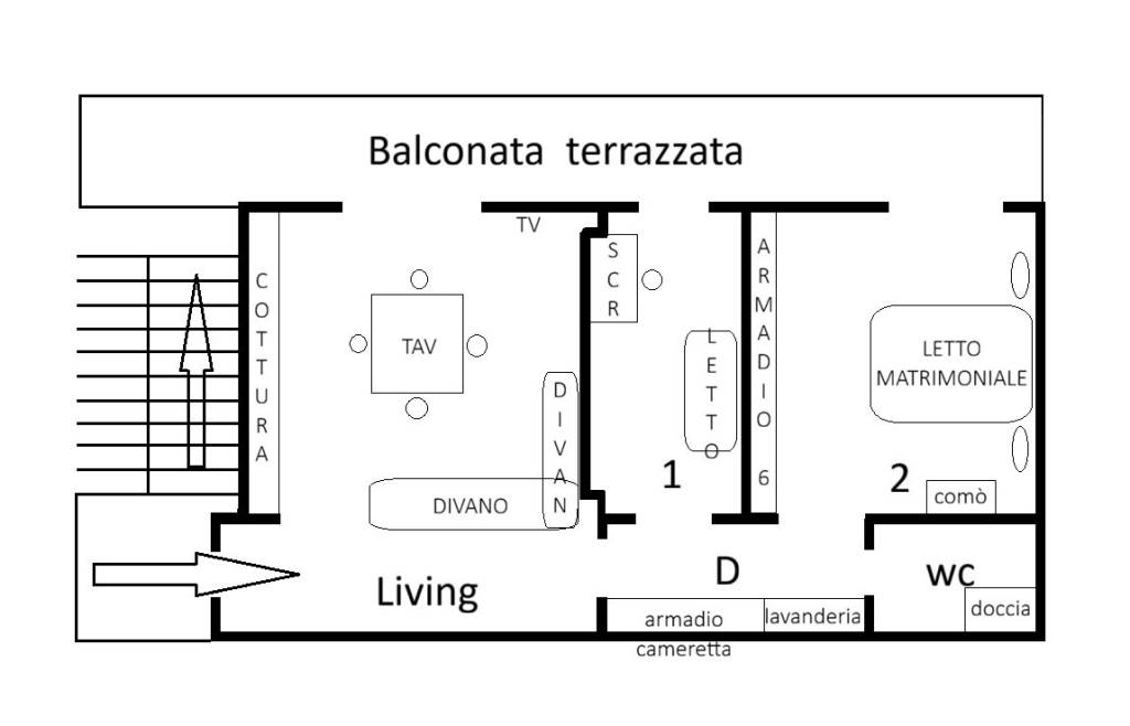 Tutti gli ambienti hanno uscita portafinestra sulla balconata che non affaccia alla strada ma dà sul cortile interno garantendo vista aperta, silenziosità e assenza di smog, il servizio igienico è finestrato.