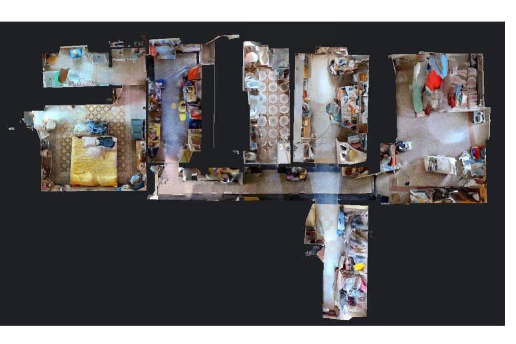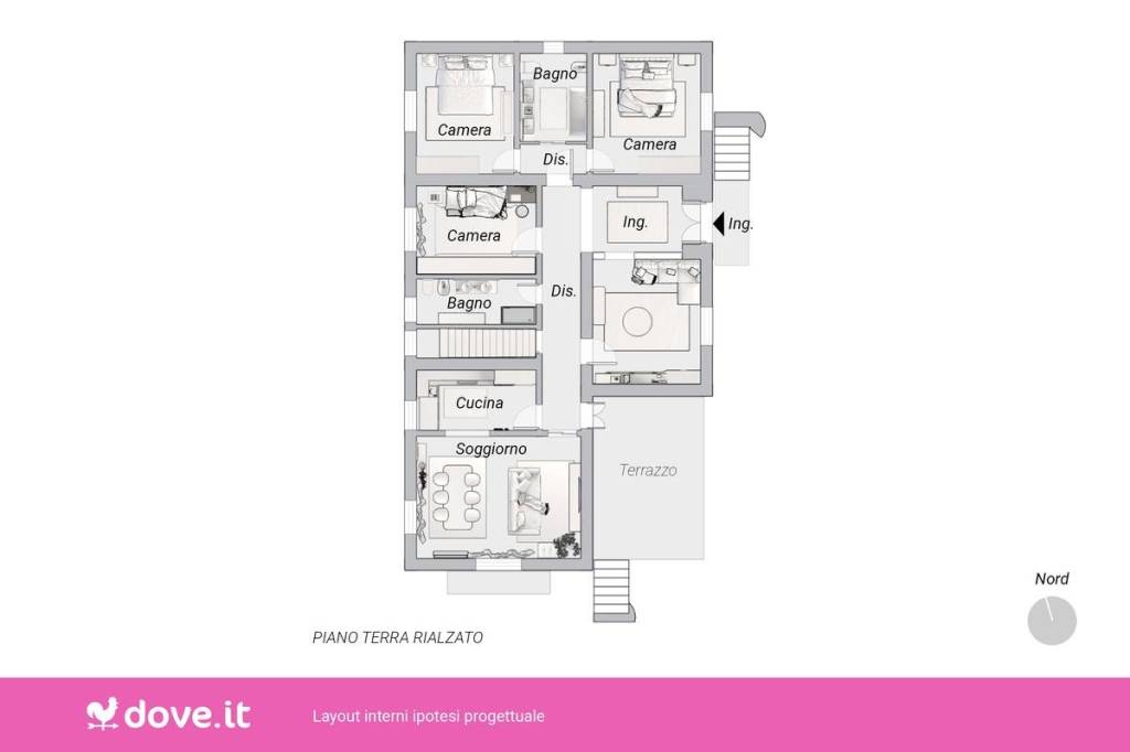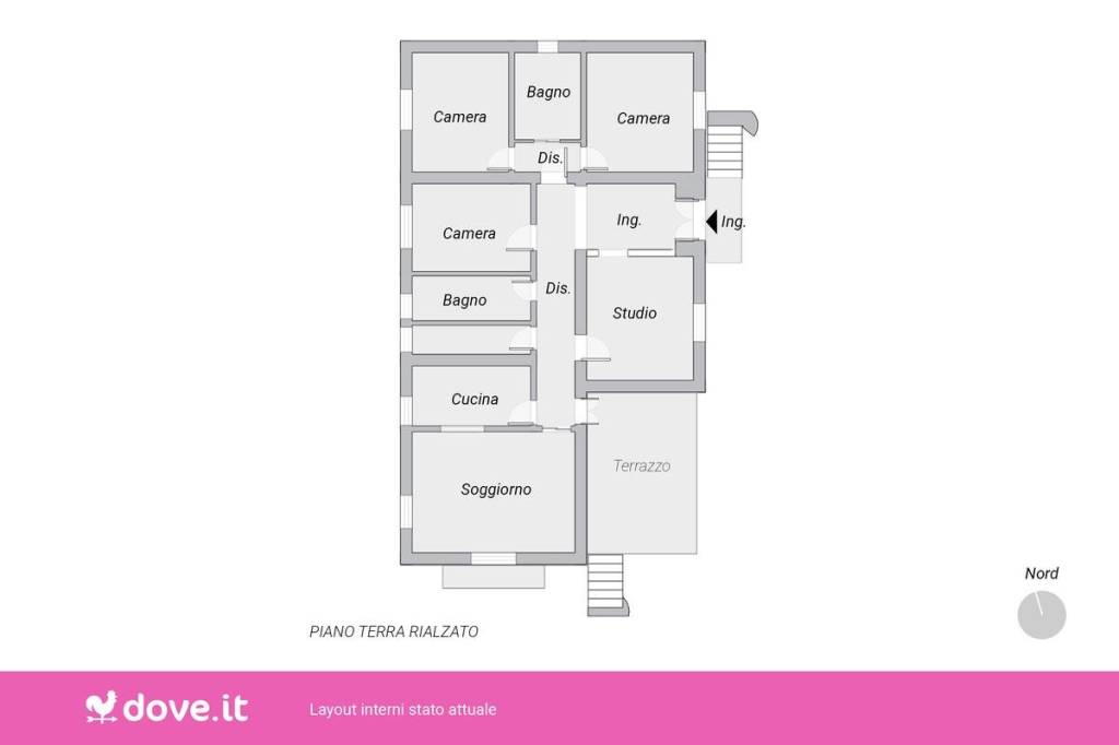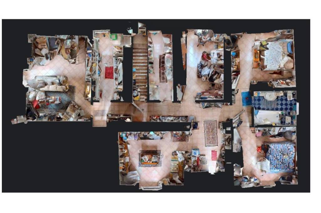 L'accesso principale si apre su un ampio disimpegno, che conduce al salotto. Sulla destra dell'ingresso si trova la zona notte, composta da due stanze matrimoniali e un bagno finestrato con vasca idromassaggio. Sulla sinistra si trova un'altra camera, utilizzabile anche come studio, una cucina semi abitabile, con collegamento, tramite scala interna, al piano seminterrato, una sala da pranzo con uscita sul giardino, e un bagno finestrato con doccia. Una scala porta al primo piano mansardato, dove si trova un ulteriore soggiorno con sala da pranzo con uscita sul giardino. Da qui si accede alla camera matrimoniale, che dispone di un balcone con vista sul giardino e di un bagno con vasca. Proseguendo lungo un secondo corridoio, situato sulla sinistra della scala, si trovano altre due stanze da letto, un'ulteriore cucina e un bagno finestrato con vasca.