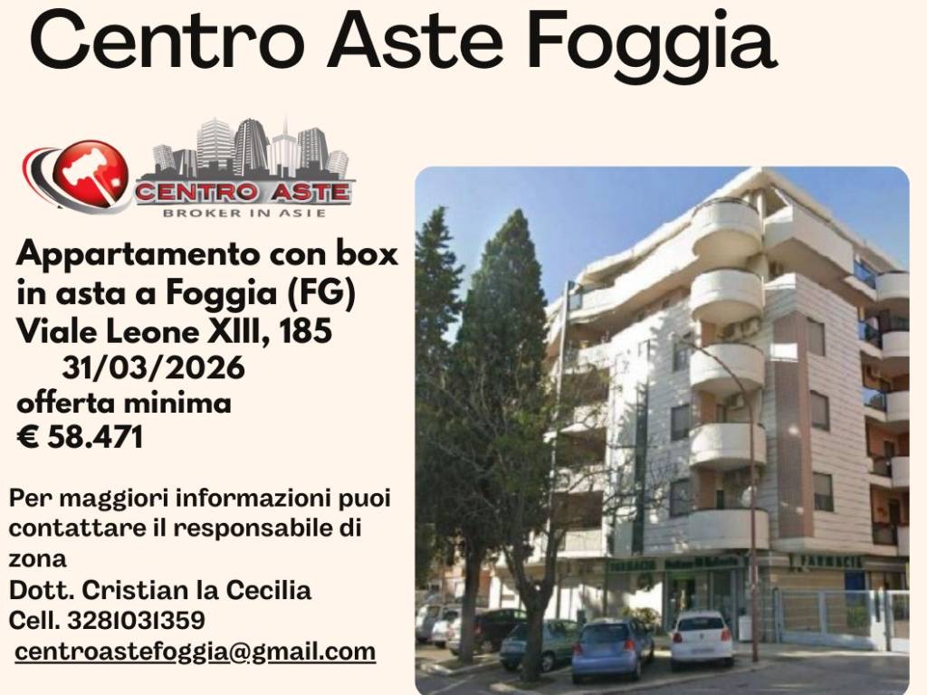 Asta appartamento con box a Foggia (FG) [SY421491] Viale Leone XIII, 185, 71121 Foggia FG, Italia Appartamento di 103 mq al II (secondo) piano di uno stabile sito in Foggia alla Via Leone XIII n. 185 composto di 5 vani e sottostante box auto di 17 mq al primo piano interrato.