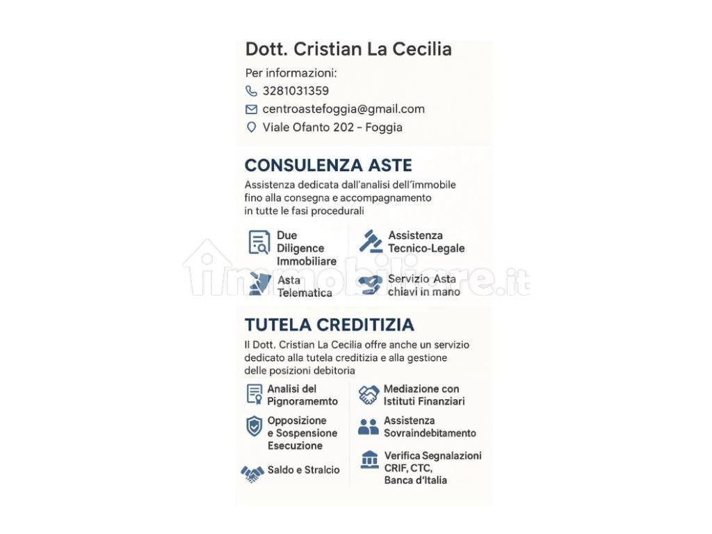 Oltre alla consulenza per l’acquisto in asta, il Dott. Cristian La Cecilia offre anche un servizio dedicato alla tutela creditizia e alla gestione delle posizioni debitorie, rivolto sia a privati che a imprese che necessitano di: • analisi tecnica della procedura esecutiva; • definizione di strategie personalizzate per contenere gli effetti del pignoramento con possibile sospensione o annullamento dello stesso; • supporto nelle opposizioni e nelle richieste di sospensione; • mediazione con istituti finanziari e ristrutturazione del debito; • percorsi di riabilitazione creditizia e ricostruzione del merito creditizio; • verifica, aggiornamento , rettifica e cancellazione delle segnalazioni nelle banche dati (CRIF, CTC, Banca d’Italia) con eventuali richieste risarcitorie ; • assistenza in procedure di sovraindebitamento (L. 3/2012 – CCII); • tutela del patrimonio familiare e aziendale in situazioni a rischio.